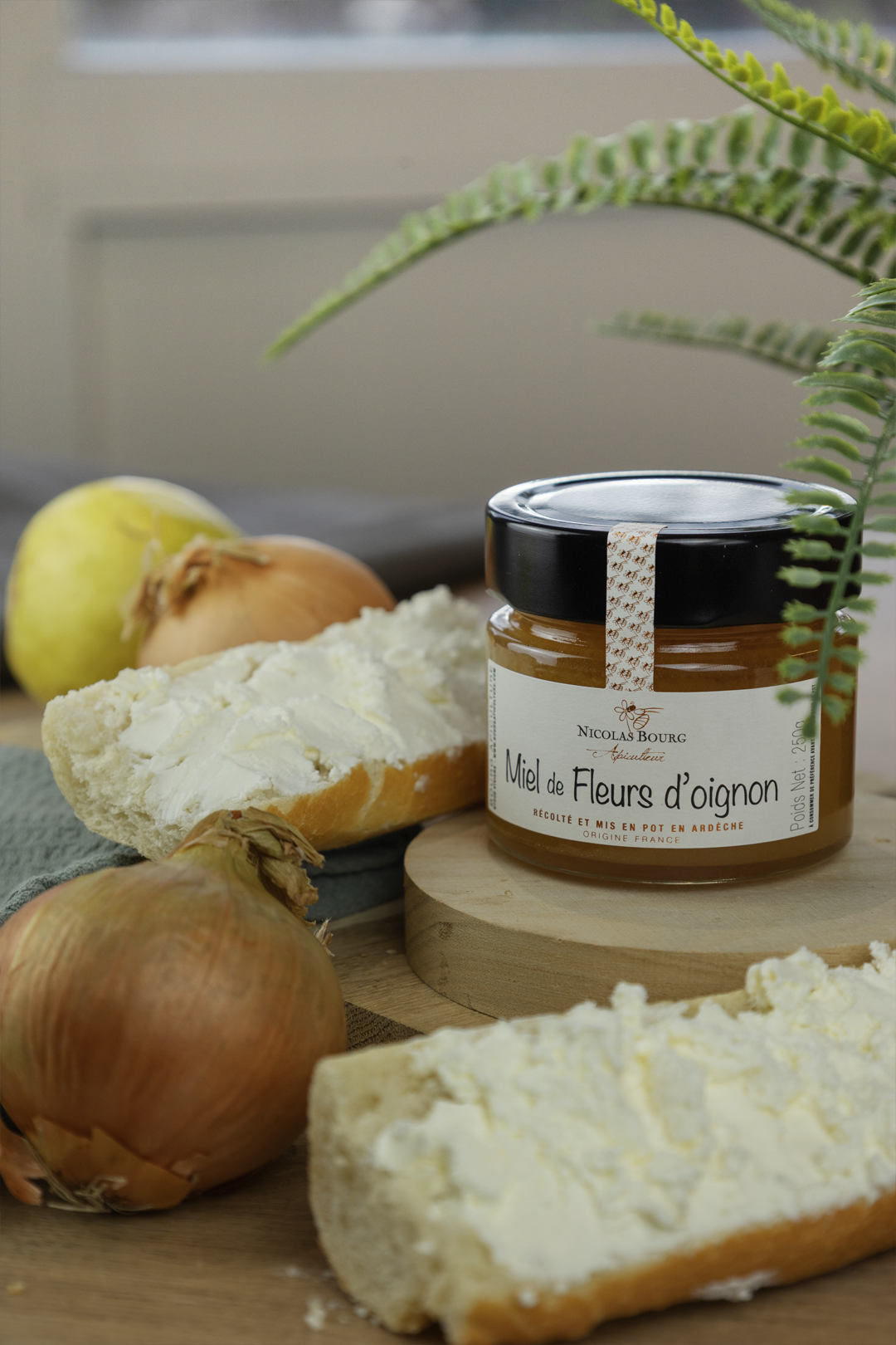 Notre miel d’oignon est récolté en sud Ardèche, au cœur d’un terroir riche et ensoleillé. Il offre une saveur douce et légèrement caramélisée, surprenante en bouche. Produit artisanalement en Ardèche, il accompagne aussi bien les fromages que les plats salés.