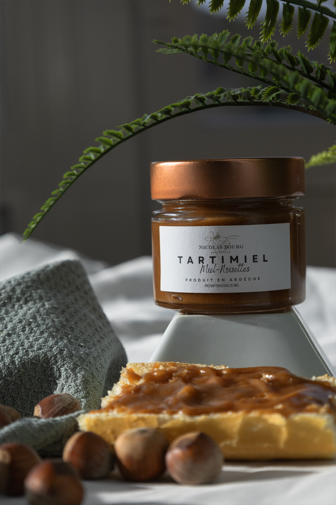 Pâte à tartiner noisette Pâte à tartiner constituée de miel crémeux et de pâte de noisettes torréfiées.